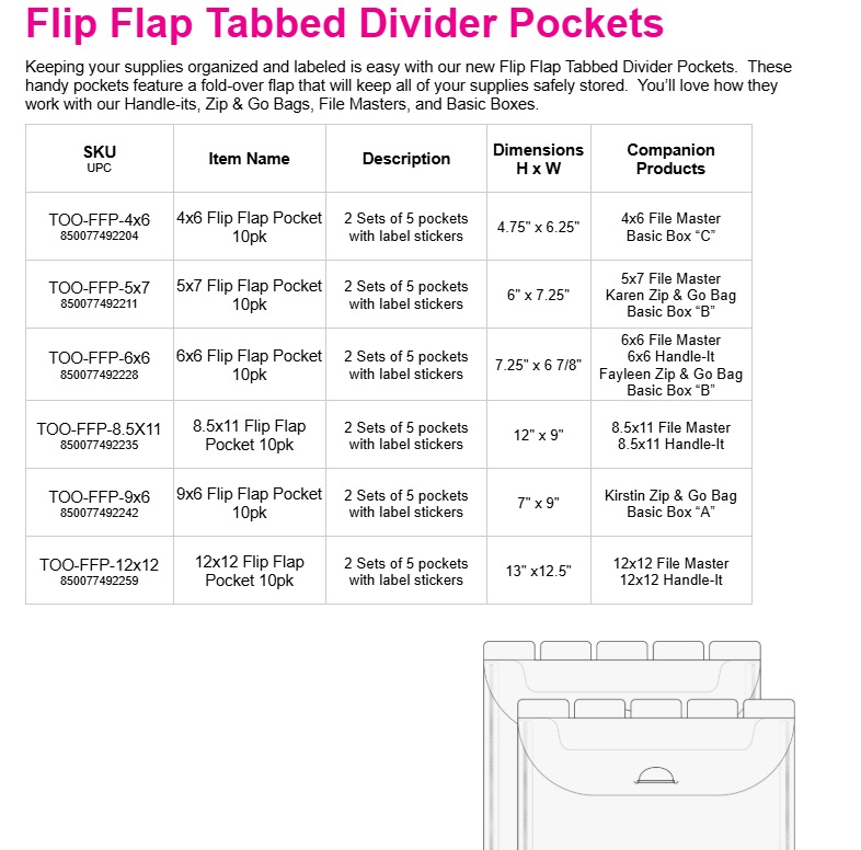 Flip Flap Tabbed Divider Pockets are clear, flexible organizers with label-ready tabs and easy-access flaps—perfect for sorting papers, projects, and craft supplies inside your Handle-Its or File Masters.